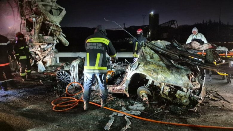 Si pasojë e përplasjes së rëndë, makina që u përplas me betonieren ka shpërthyer në flakë dhe katër  personat janë djegur brenda.