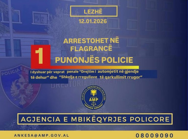 Agjencia e Mbikëqyrjes Policore (Rajoni Shkodër–Lezhë) ka arrestuar në flagrancë punonjësin e policisë I.D., me detyrë shef i Logjistikës pranë DVKM Kukës, i dyshuar për kryerjen e veprave penale “Drejtimi i automjetit në gjendje të dehur” dhe “Shkelja e rregullave të qarkullimit rrugor”.