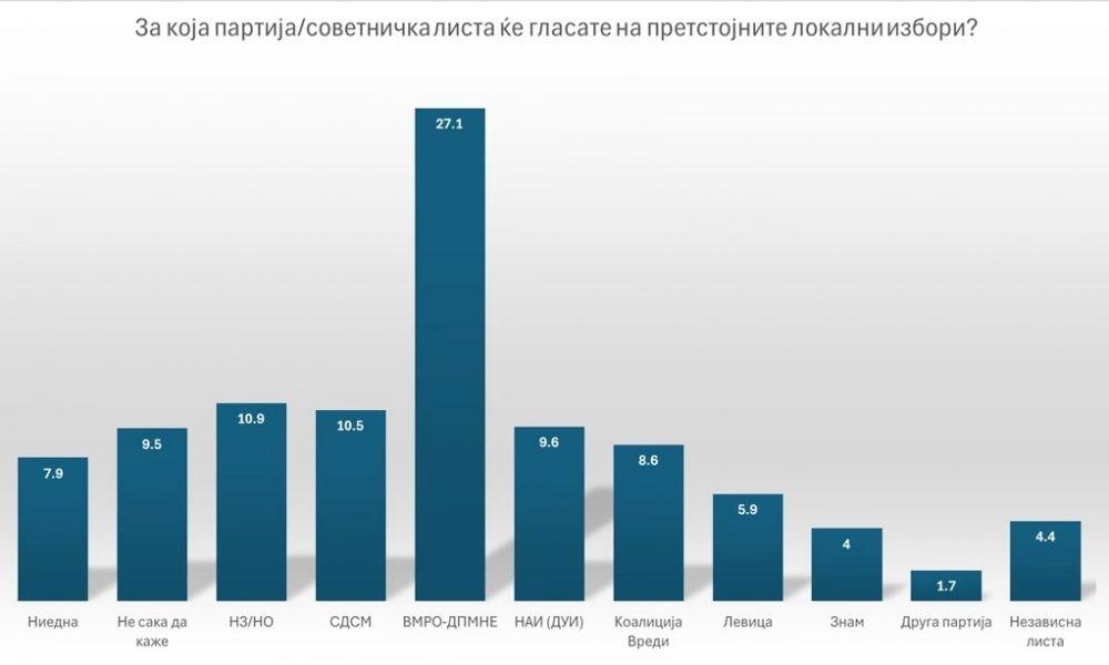 Në pyetjen se për cilën listë këshilltarësh do të votonin, 27.1% e të anketuarve thanë se do të votonin për VMRO-DPMNE-në, ndërsa 10.5% thanë se do të votonin për LSDM-në. Ndërsa te partitë shqiptare për BDI 9.6%, koalicioni VLEN me 8.6%, Levica me 5.9% dhe ZNAM me 4.0%.