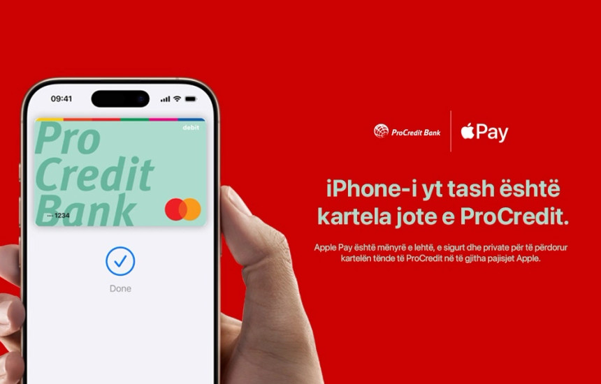 ProCredit Bank Kosova, në 25-vjetorin e veprimtarisë së saj në tregun bankar në Kosovë, prezanton Apple Pay për klientët e saj – një mënyrë më të sigurt, më të mbrojtur dhe më private për të paguar me iPhone dhe Apple Watch. Ky shërbim i ri u mundëson klientëve të shmangin dhënien e kartelës së pagesës personave të tjerë, prekjen e butonave fizikë apo shkëmbimin e parasë në dorë, duke përdorur fuqinë e iPhone për të mbrojtur çdo transaksion.