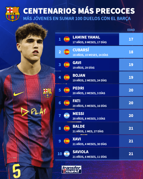 Me 18 vjet, 10 muaj dhe 24 ditë, Cubarsi u bë lojtari i dytë më i ri në histori që arriti 100 paraqitje për Barçën.