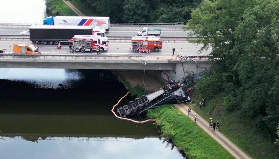 “Kamioni me gjysmërimorkio më pas doli nga rruga në të djathtë, theu kangjellat e urës dhe u përplas në një shteg ecjeje pranë Kanalit Elba-Lübeck”, tha një zëdhënëse e policisë .