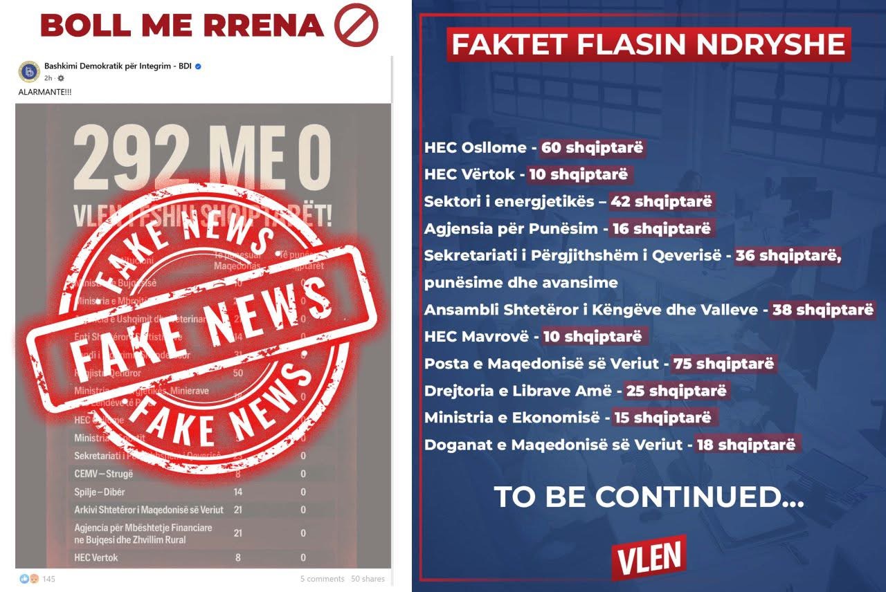 Reagimi vjen pasi BDI publikoi një grafikë duke pretenduar se VLEN nuk ka sjellë asnjë shqiptar në punësim, të shoqëruar me mbishkrimin “Fake News”. Por, VLEN është kundërpërgjigjur me shifra konkrete dhe institucione ku shqiptarët janë punësuar ose avancuar, që sipas tyre hedhin poshtë propagandën e BDI-së.