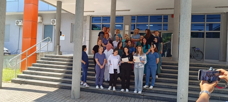 Tetovë, 4 qershor – Njerëzit që punojnë si infermierë dhe teknikë, mjekë, shërbime teknike dhe administratë në Spitalin klinik Tetovë e kanë vendosur në pezullim të përkohshëm pçrotestën e tyre të çdoditshme, me të cilën kanë kërkuar t’i paguajnë pagat e papaguara si dhe vendimet për punësim në kohë të pacaktuar. Në ditën e sotme të katërt me radhë që tubohen dhe shprehin revoltën theksuan se janë të zhgënjyer nga ajo që nuk kanë mbështetje më të madhe nga opinioni, prandaj do të presin të emërohet ministri i ri i Shëndetësisë me shpresë se do të zgjidhet problemi i tyre.
