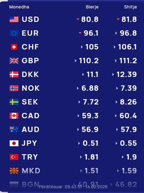 Ndërkohë monedha evropiane euro do blihet me 96.1 lekë dhe do shitet me 96.8 lekë.