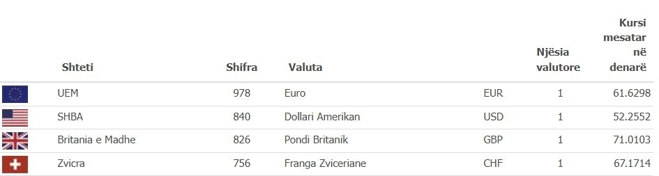 Sipas listës së kursit të këmbimit të Bankës Popullore, kursi mesatar i këmbimit të euros sot është 61.6298 denarë, dhe i dollarit amerikan është 52.2552 denarë. Kursi mesatar i këmbimit të paundit britanik është 71.0103 denarë.