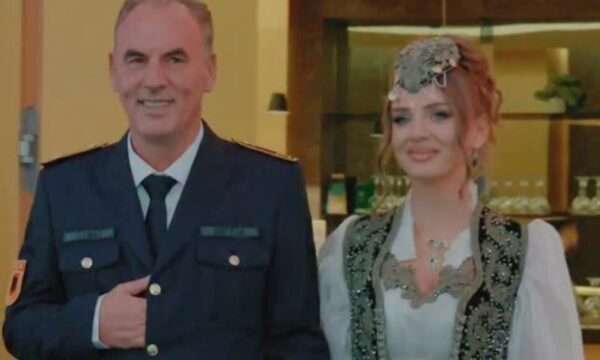 Ai shihet me uniformë ushtarake teksa përcjell vajzën në sallë.