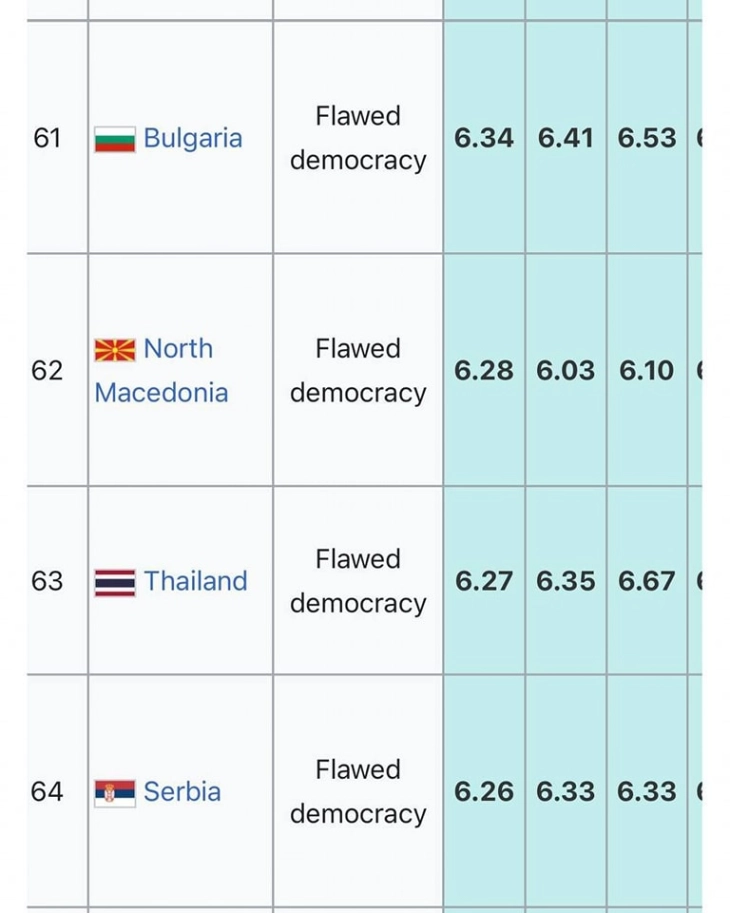 Pas Maqedonisë, ka shkruar Mickoski, ishin Serbia, Shqipëria dhe Bosnja e Hercegovina. Serbia është në vendin e 64-të, Shqipëria në vendin e 66-të dhe Bosnja e Hercegovina në vendin e 88-të. Në vitin 2023 dhe 2022, Maqedonia u rendit e 72-ta në listën e “Ekonomist” të shquar në lidhje me Indeksin e listës për demokracinë.