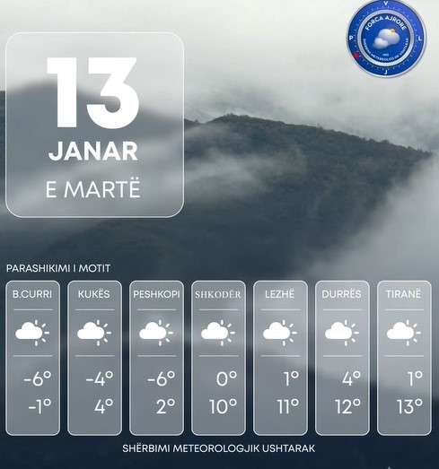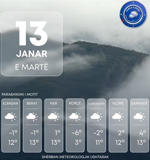Shërbimi Meteorologjik Ushtarak bën të ditur se Shqipëria të martën do të ndikohet nga kushte atmosferike të qëndrueshëm.