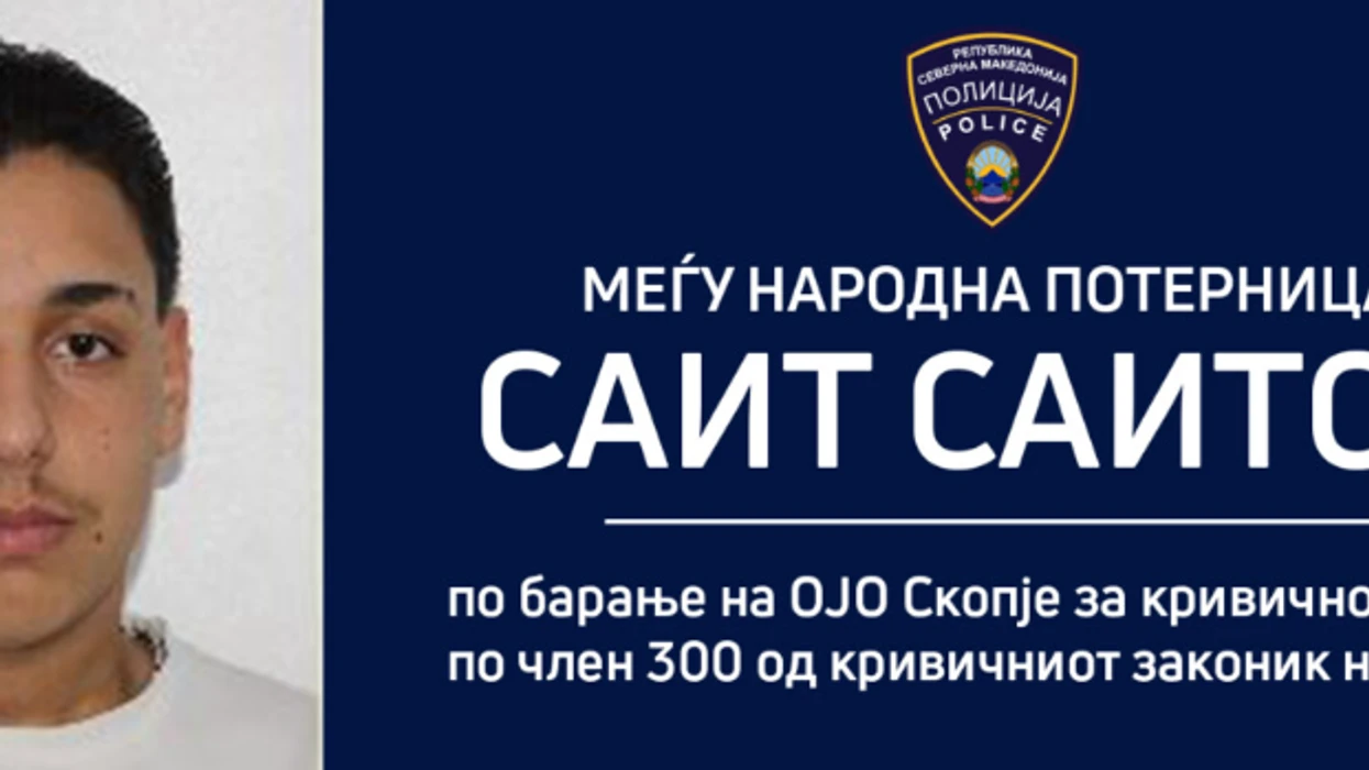 “Ministria e Punëve të Brendshme (MPB) shpalli urdhër-arrest ndërkombëtar për Sait Saitov (18) nga Shkupi, i biri i Bertit dhe i nënës Ganimete nga Shkupi. Personi kërkohet me urdhër qendror dhe ndërkombëtar, sipas kërkesës së Prokurorisë Publike të Shkupit, për vepër penale sipas nenit 300 të Kodit Penal”, njofton MPB.
