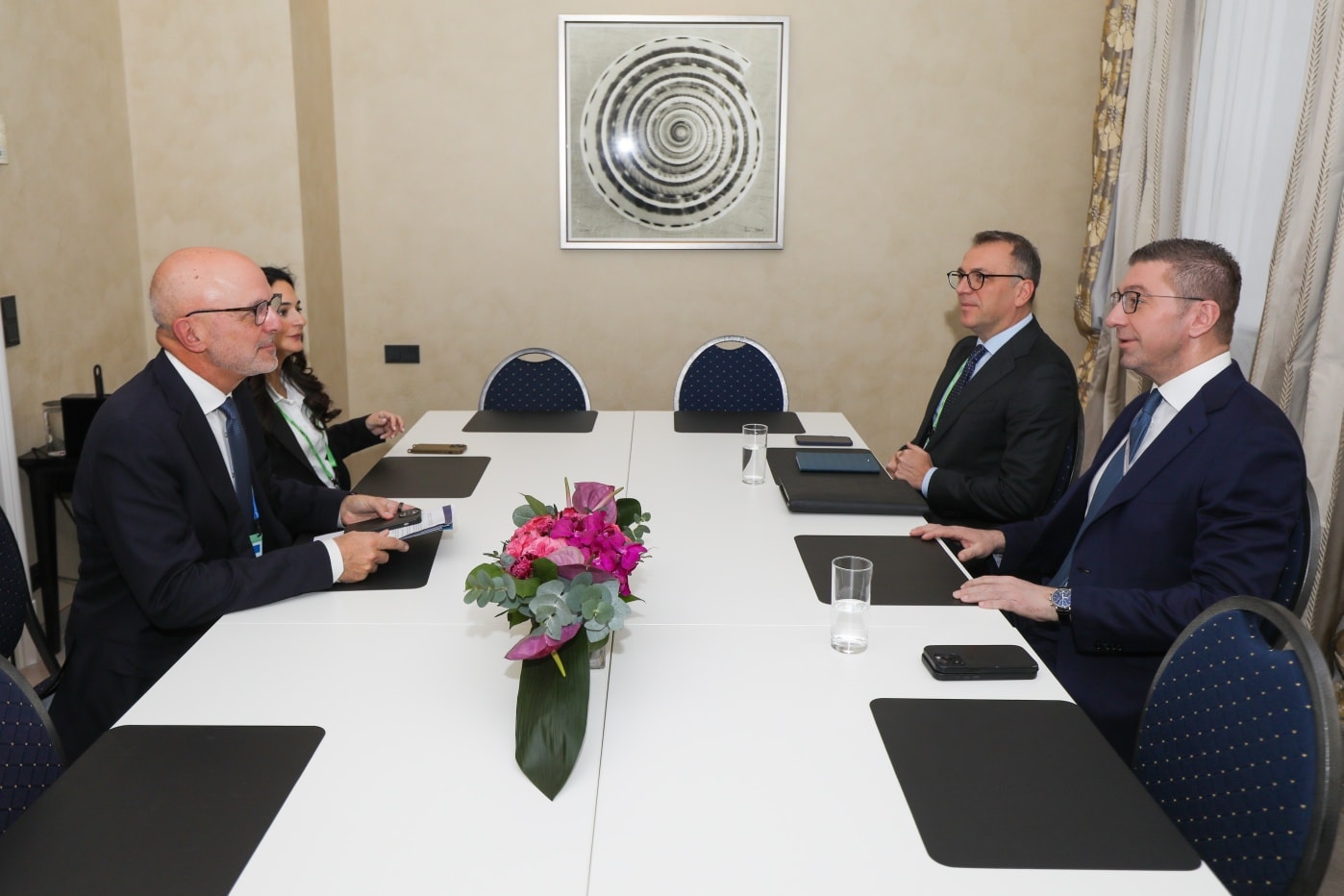 Mickoski shoqërohet nga ministrat e Mbrojtjes, Vllado Misajllovski, Punëve të jashtme dhe Tregtisë së Jashtme, Timço Mucunski dhe Punëve të Brendshme, Pançe Toshkovski.