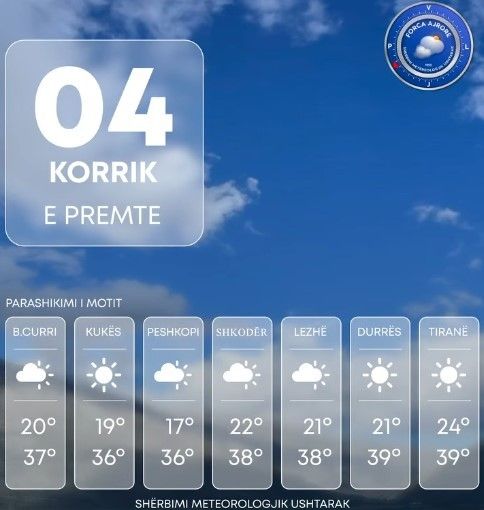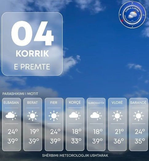 Shërbimi Meteorologjik Ushtarak bën të ditur se moti parashikohet i kthjellët dhe me kohëzgjatje të orëve me diell në të gjithë territorin për pjesën më të madhe të ditës, ndërsa vranësirat do të jenë të pakta kalimtare në relievet malore.