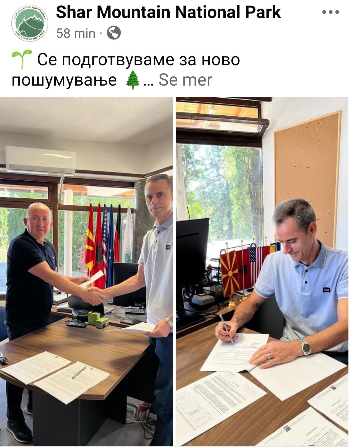 Shkup, 19 shtator – Institucioni Publik Parku Kombëtar “Mali Sharr”, i udhëhequr nga drejtori Evzal Elmazi, ka nënshkruar marrëveshje donacioni me Shoqërinë për agrikulturë Pure Promise SHPK Tetovë, e cila parasheh pyllëzimin e 12 hektarëve në lokacione të ndryshme brenda parkut.