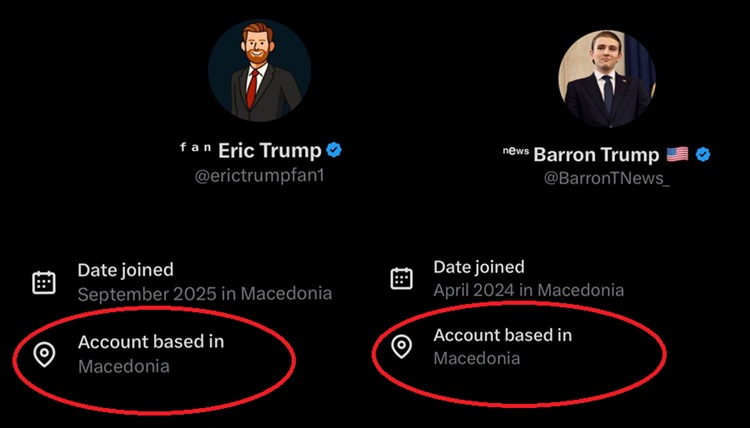 Po ashtu, fan-profili i Eric Trump, njërit prej djemve të presidentit amerikan, tani në vend të “Maqedoni” shfaq prejardhje “Europa Lindore”, ndërsa profili i verifikuar me lajme për Barron Trump gjithashtu nuk figuron më si maqedonas, por si profil nga “Europa Lindore”.