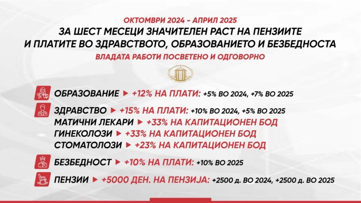 Shkup, 10 prill – Gjatë gjashtë muajve të fundit, Qeveria ka rritur pagat e të punësuarve në shëndetësi, arsim dhe siguri.