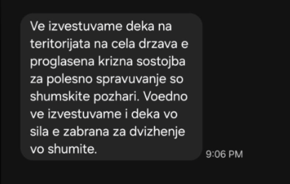 Shkup, 10 korrik – Qytetarët sot morën një mesazh ku thuhej se në shtet është shpallur gjendja e jashtëzakonshme dhe se lëvizja në pyje është ndaluar. Qendra e Menaxhimit të Krizave (QMK) bën me dije se është një mesazh testimi që po testohet për të dërguar mesazhe alarmi në të ardhmen.