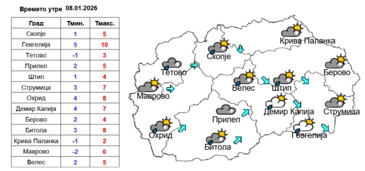 Në Shkup moti do të jetë i ndryshueshëm me vranësira dhe me reshje të kohëpaskohshme të shiut, posaçërissht nga fundi i ditës dhe gjatë natës. Do të fryjë erë e matur nga drejtimi jugor. Temperatura do të arrijë deri 9 gradë.