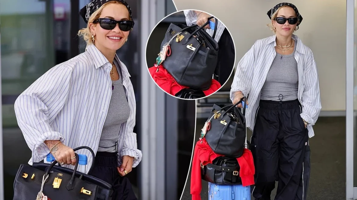 Rita kishte zgjedhur rehati për udhëtimin, duke e kompletuar paraqitjen me pantallona të zeza sportive dhe atlete të bardha Nike.