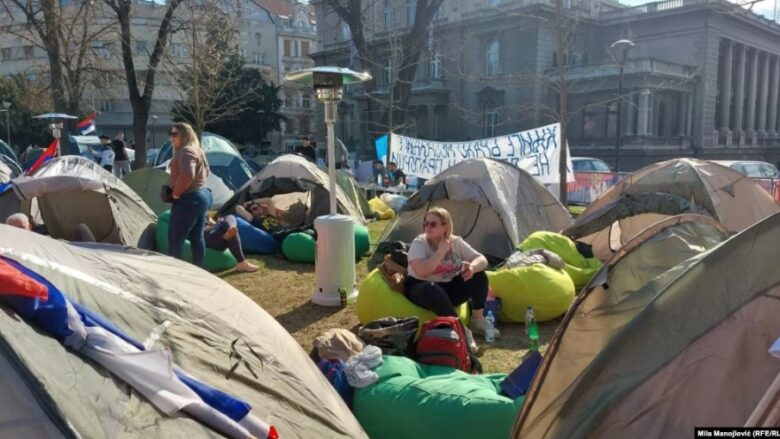 “Kemi ardhur nga Kosova. Vullnetarisht. Askush nuk na organizoi”, thotë për Radion Evropa e Lirë një nga të mbledhurit në Parkun e Pionierit në Beograd, ku është ngritur një kamp i studentëve, që kundërshtojnë bllokadat e fakulteteve.