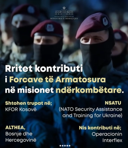 “Në vitin 2025, FA do të ketë prani të shtuar me 50 trupa në misionet e KFOR në Kosovë, ALTHEA në Bosnjë dhe Hercegovinë, NSATU dhe Operacionin Interflex, dy të fundit në mbështetje të Ukrainës, duke konfirmuar dinamizmin e angazhimeve te Shqipërisë në mbështetje të paqes, sigurisë dhe stabilitetit në botë”, nënvizon Vengu në një postim në rrjetet sociale.