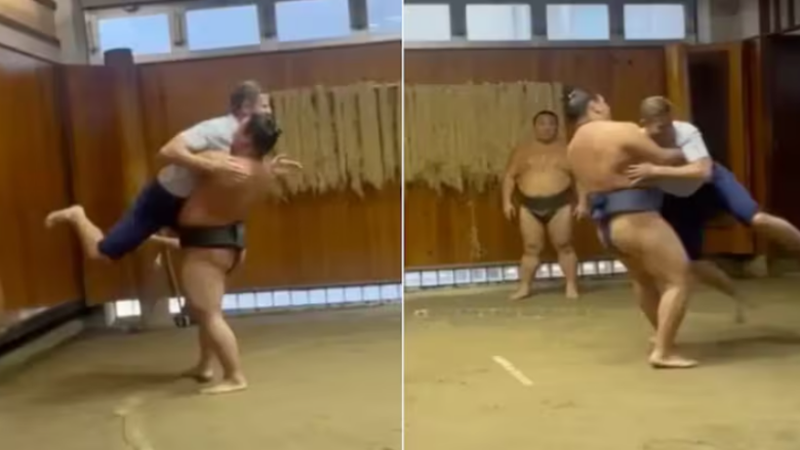 Në pamjet që janë shpërndarë me shpejtësi në rrjete sociale, shihet Eric Trump teksa përballet me një Yokozuna, titulli më i lartë në sportin e sumos. Tentativa e tij për ta shtyrë kundërshtarin jashtë ringut përfundoi me një skenë argëtuese: kampioni e ngriti dhe e hodhi me lehtësi jashtë.