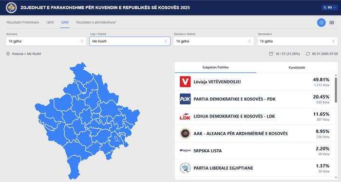 Sipas të dhënave të publikuara në platformën zyrtare të KQZ-së, deri në momentin e përditësimit janë numëruar 18 nga 57 vendvotime, apo 31.58% e totalit të votave me kusht.