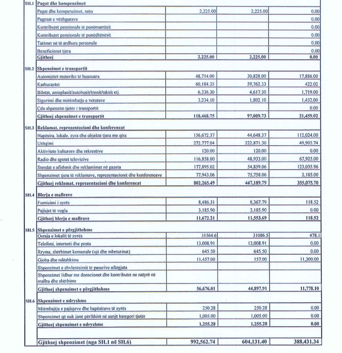 Lëvizja Vetëvendosje, për periudhën 09.06.2025-09.11.2025 ka shpenzuar mbi 388 mijë euro në të cilën përfshihen shpenzimet e pagave dhe kompensimet, të transportit, reklama, blerjet e mallrave, etj.